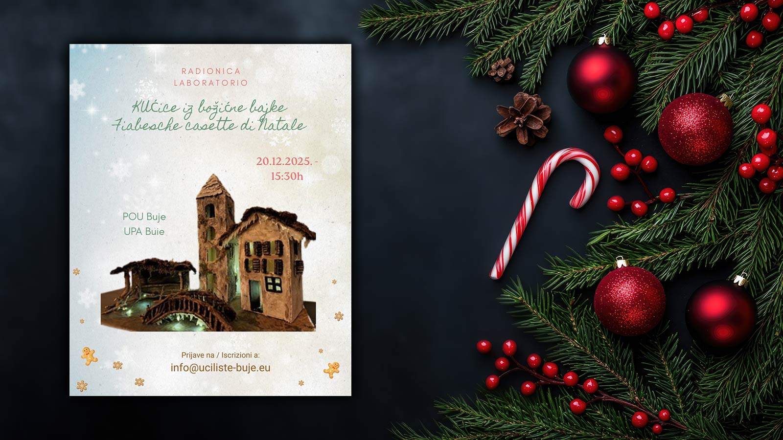 Kreativna božićna radionica izrade kućica od recikliranih materijala u Bujama. Stvaranje, druženje i blagdanski duh za sve generacije.