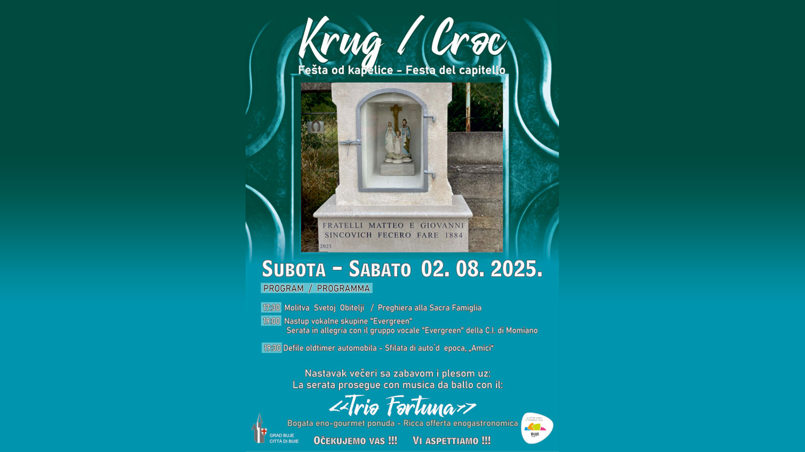 Fešta od kapelice - Krug u subotu, 2. kolovoza, postaje mjesto druženja uz molitvu, glazbu, oldtimere i bogatu eno-gourmet ponudu.