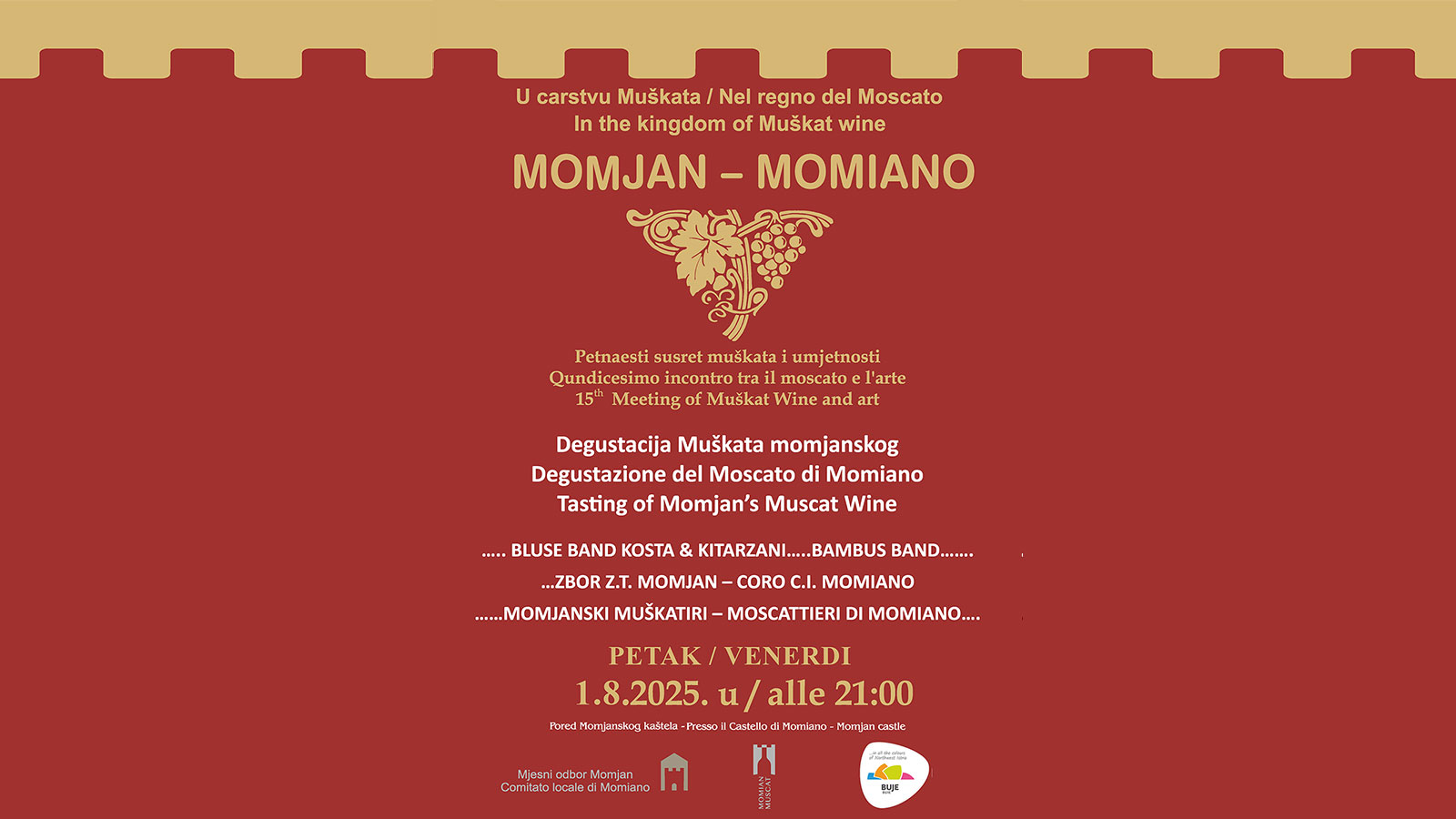 Odgođena manifestacija “U carstvu muškata” održat će se u Momjanu u petak, 1. kolovoza u 21 sat, uz degustaciju vina i bogat glazbeni program.