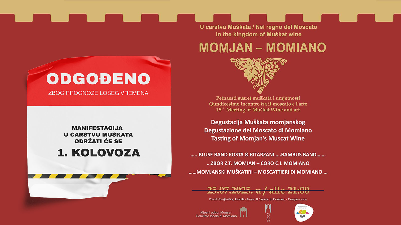 Zbog najave lošeg vremena, manifestacija „U carstvu muškata“, koja se trebala održati danas u Momjanu, odgađa se i bit će...