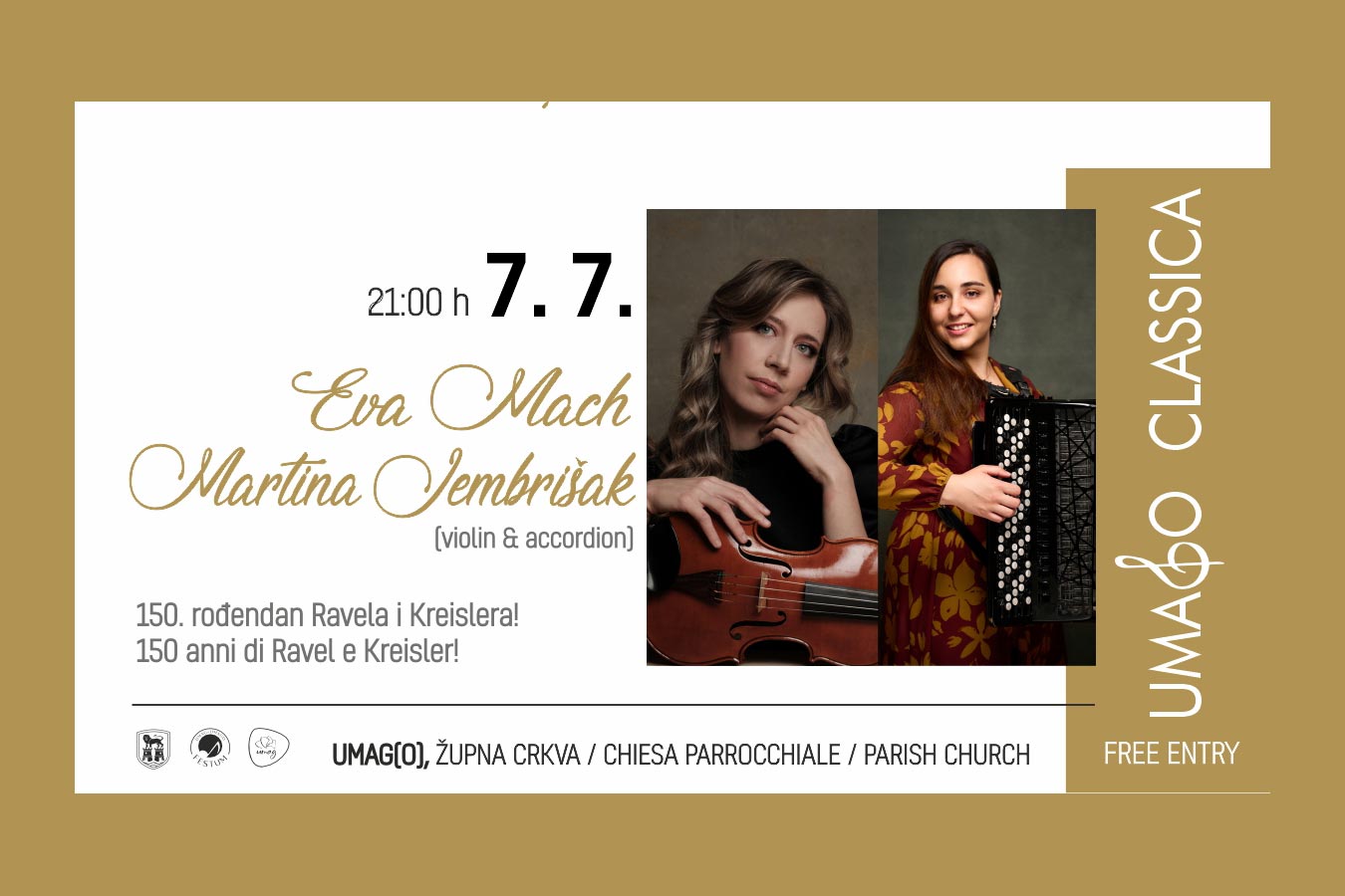 Koncert 150 godina Kreislera i Ravela u subotu 5.7. u 20 sati u crkvi sv. Servula, Buje. Nastupaju Eva Mach i Martina Jembrišak.