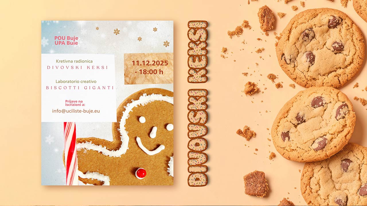 Kreativna radionica izrade divovskih božićnih keksa 11.12.2025. u POU Buje uz izradu medenjaka i ukrašavanje grada. Besplatno, uz prijavu mailom.