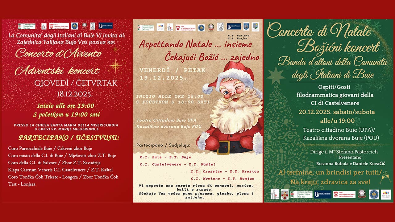 U Bujama se od 18. do 20. prosinca 2025. održavaju tri glazbena događanja u organizaciji Zajednice Talijana, uz sudjelovanje više zborova i glazbenih skupina.