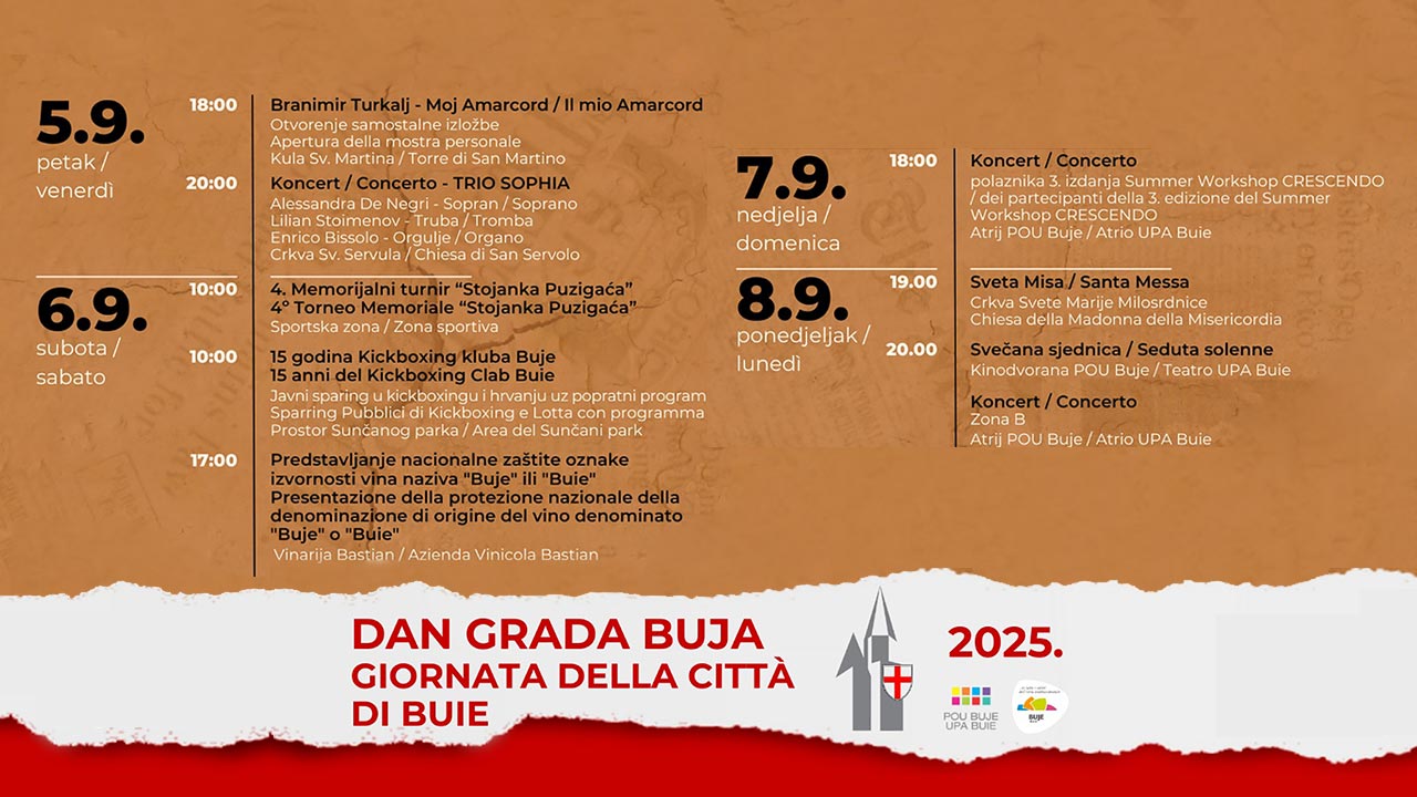 Od 5. do 8. rujna u Bujama se obilježava Dan Grada Buja kroz raznovrstan program koji spaja umjetnost, glazbu, sport...