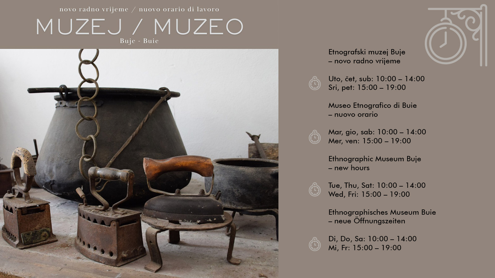 Etnografski muzej u Bujama od sada radi prema novom rasporedu. Posjetitelji će bogatu kulturnu baštinu kraja moći razgledati utorkom, četvrtkom i subotom od 10 do 14 sati, te srijedom i petkom od 15 do 19 sati.