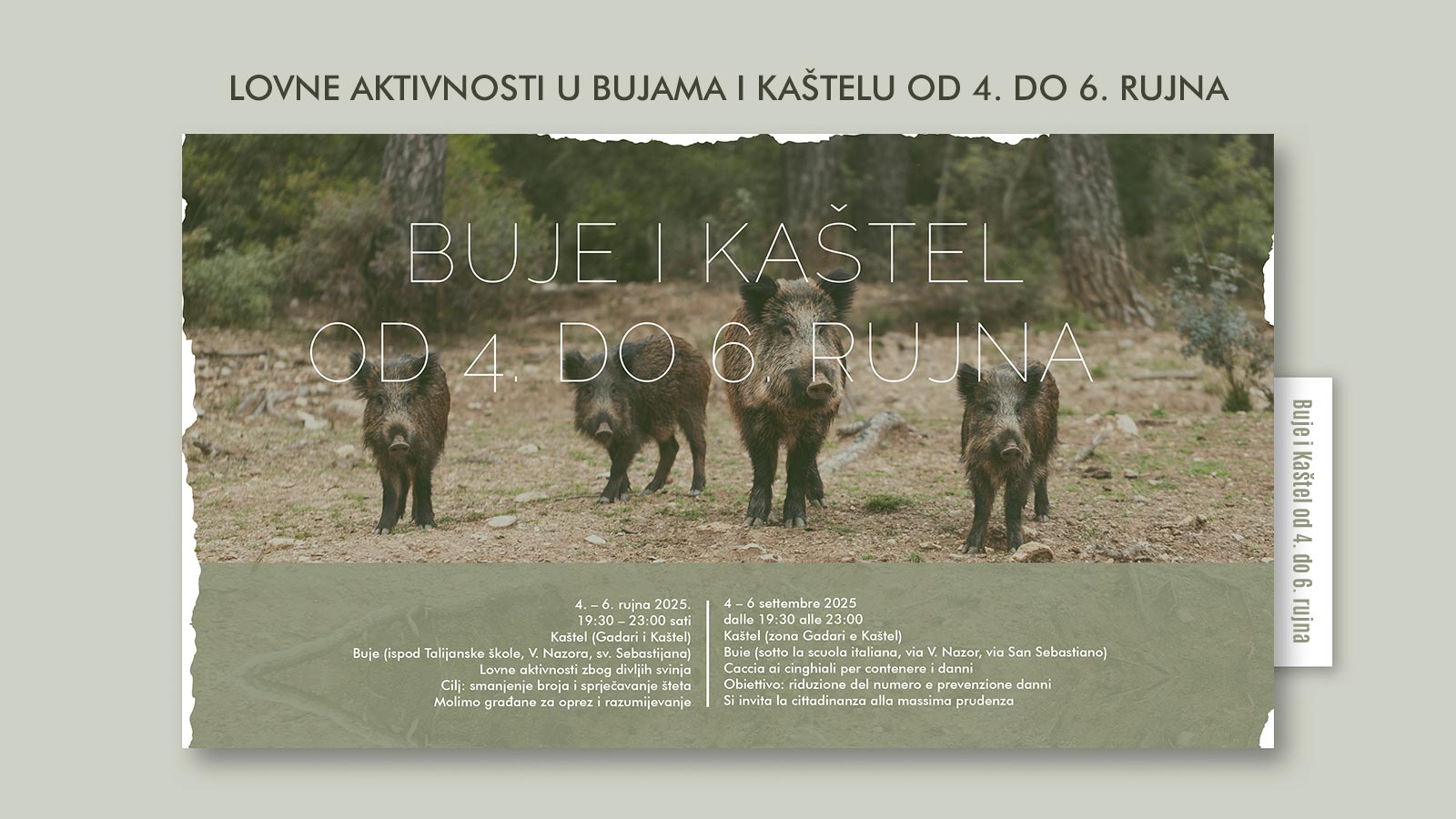 Od 4. do 6. rujna u Kaštelu i Bujama provodit će se lovne aktivnosti zbog prekomjernog broja divljih svinja i sprječavanja šteta.