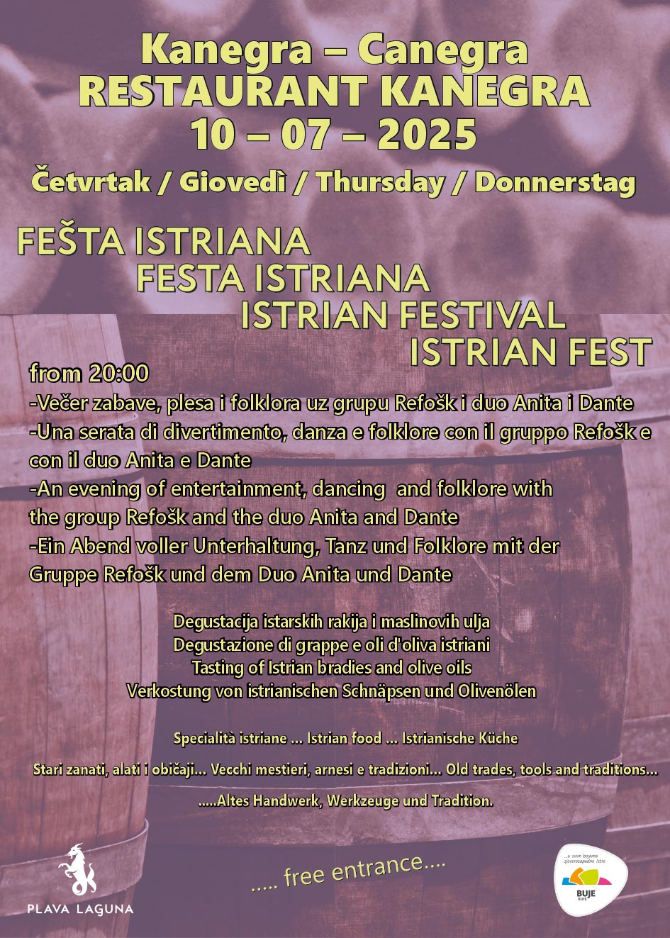 Uz glazbeni nastup grupe Refošk i dua Anita & Dante, očekuju vas degustacije istarskih rakija i maslinovih ulja, domaće delicije, prezentacije starih zanata i običaja te autentična istarska atmosfera.
