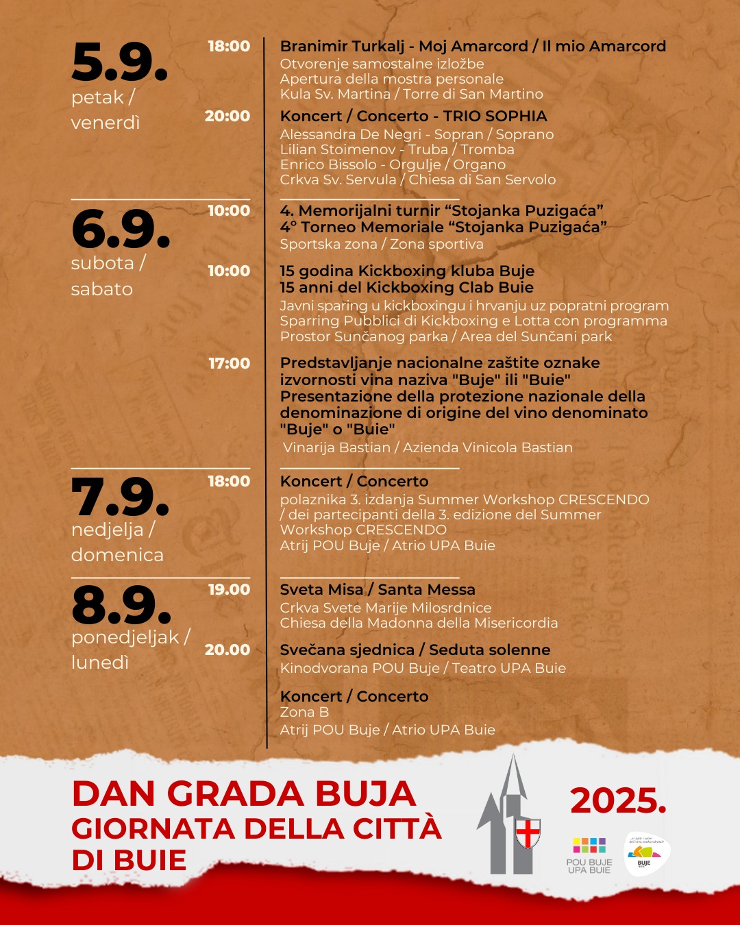 Ovogodišnji program Dana Grada Buja donosi spoj kulture, sporta i glazbe kroz sadržaje koji su pristupačni i povezani s lokalnim životom. Proslava i dalje ostaje trenutak okupljanja, slavljenja tradicije i stvaranja novih uspomena – u duhu grada koji se razvija, ali ostaje vjeran sebi.