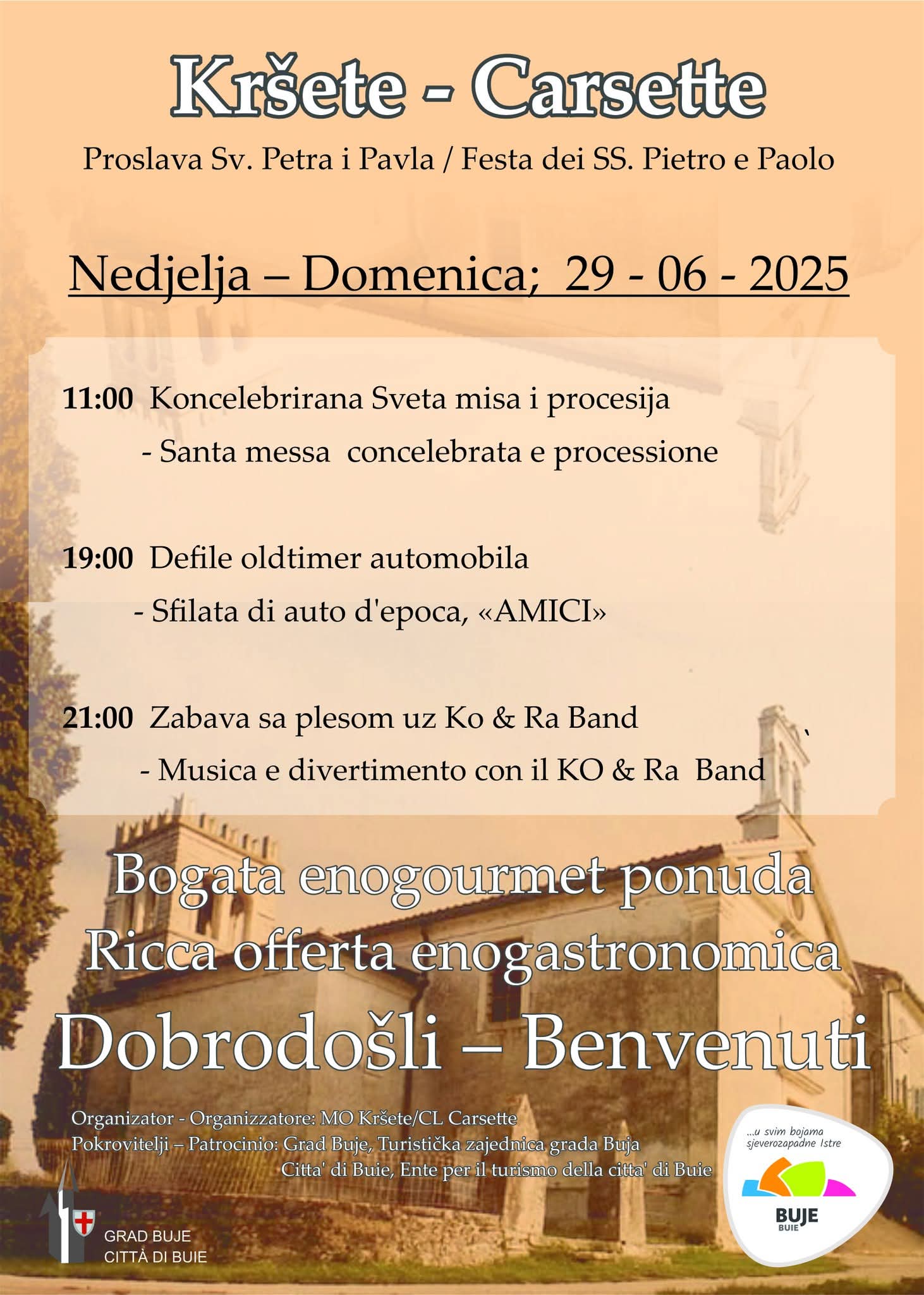 Domenica 29 giugno a Carssette si festeggia la ricorrenza dei Santi Pietro e Paolo con un programma ricco che unisce spiritualità, gastronomia e musica.