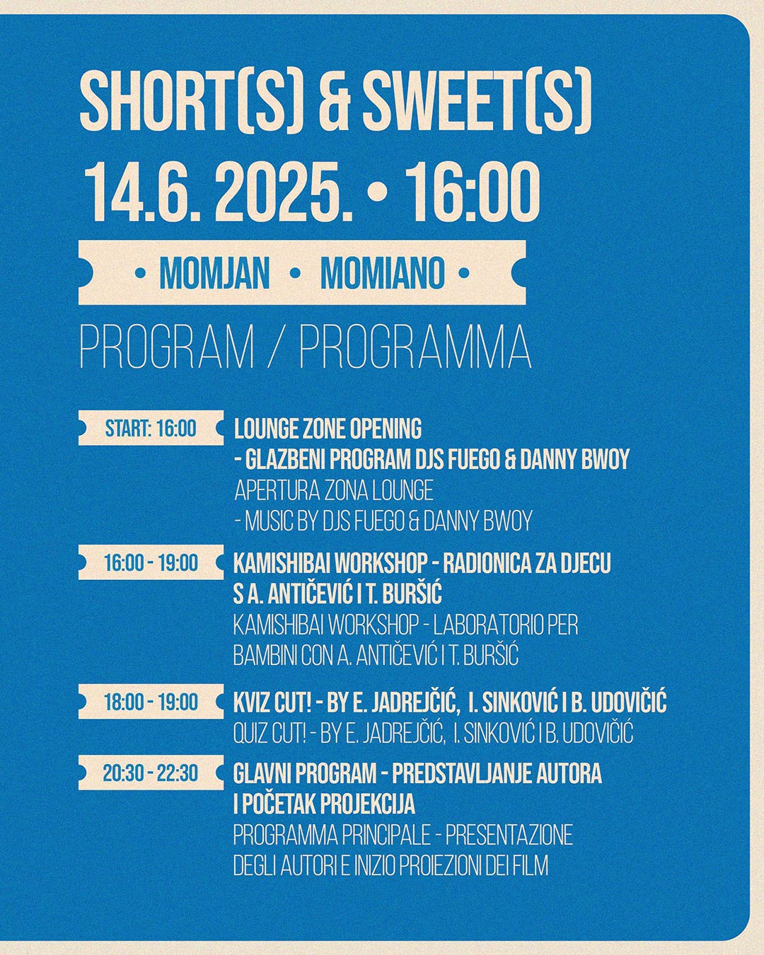 La parte pomeridiana del programma, dalle 16:00 alle 19:00, è dedicata a un laboratorio creativo per bambini e giovani – Kamishibai, la tradizionale forma giapponese di narrazione con illustrazioni, condotto da Toni Buršić e Anđela Antičević. La partecipazione è gratuita e i posti sono limitati. Le iscrizioni si effettuano tramite i social network di Cinema Oko e FKM Novigrad-Cittanova. L’anteprima della serata sarà il quiz cinematografico CUT! alle 18:00, condotto da tre appassionati di quiz. Il quiz riunisce amanti del cinema e della cultura pop, offrendo una dimensione divertente e interattiva all’evento.
