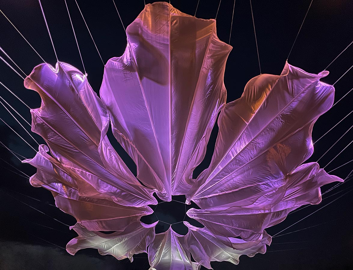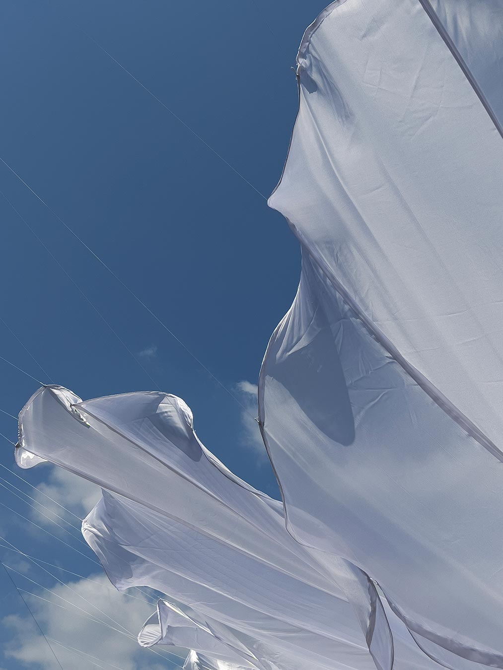 L’opera, di dimensioni monumentali, è composta da elementi tessili leggeri e traslucidi che reagiscono alla luce e al movimento, creando un dialogo poetico con l’architettura storica del castello. L’effetto sonoro e luminoso è curato dall’artista multimediale Alex Brajković, offrendo al pubblico un’esperienza multisensoriale unica.