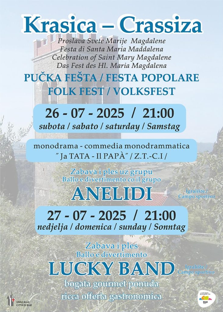 Venite al campo sportivo di Crassiza, passate un fine settimana all’insegna della musica, del ballo e dell’ottima atmosfera e godetevi una vera festa istriana!